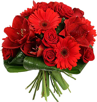 Bouquet rond rouge avec roses,gerberas,amarilys et feuillage.